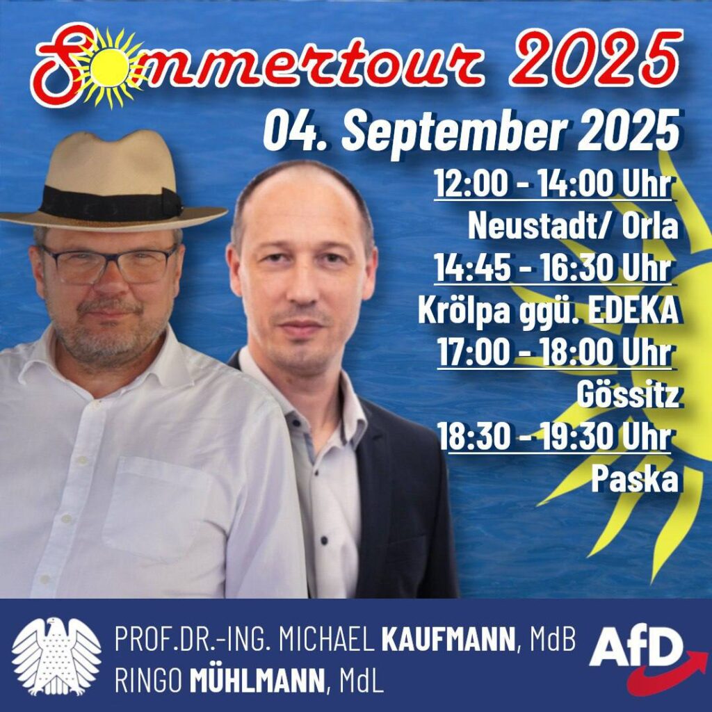 12:00 - 14:00 Uhr Neustadt/Orla 14:45 - 16:30 Uhr Krölpa ggü. EDEKA 17:00 - 18:00 Uhr Gössnitz 18:30 - 19:30 Uhr Paska