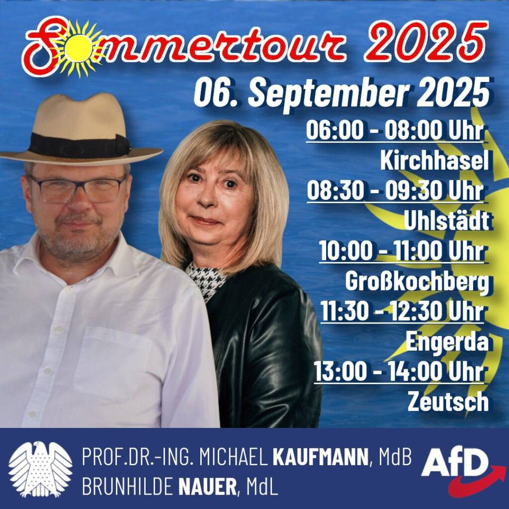 06:00 - 08:00 Uhr Kirchhasel 08:30 - 09:30 Uhr Uhlstädt 10:00 - 11:00 Uhr Großkochberg 11:30 - 12:30 Uhr Engerda 13:00 - 14:00 Uhr Zeutsch